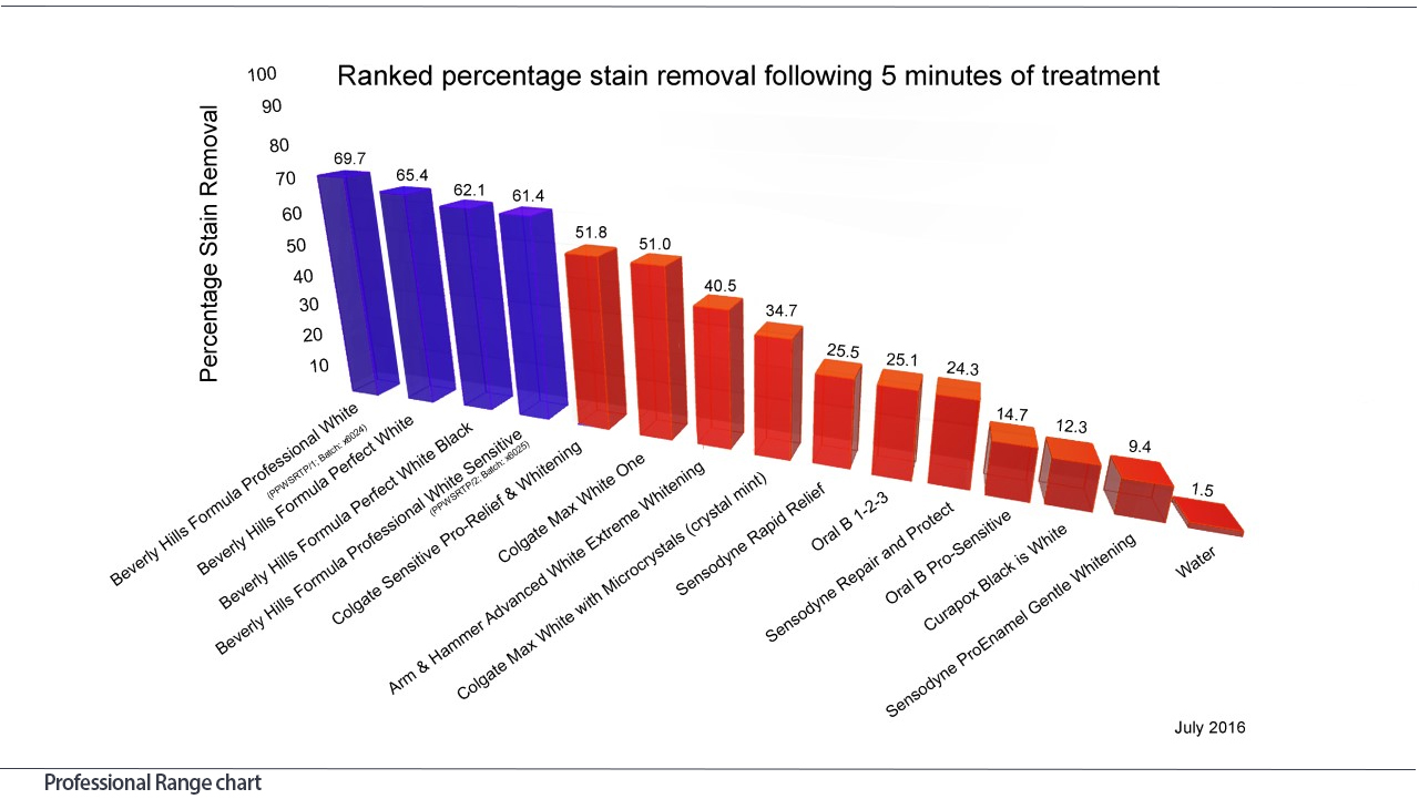 Recent independent research has indicated just how effective Beverly Hills Formula products are at stain removal with several of its leading ‘black’ whitening products rated highest in stain removal compared with other brands; see chart.