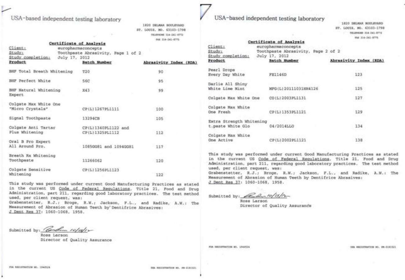 Interestingly, a USA-based independent testing laboratory (July 2012) tested the abrasion levels of 15 toothpastes. The results confirmed that Beverly Hills Formula’s whitening toothpaste is less abrasive than other leading brands of both whitening and regular toothpastes. In fact, Beverly Hills Formula Perfect White scored as low as 95 on the Abrasivity Index Table, whilst some leading competitors displayed levels as high as 138.