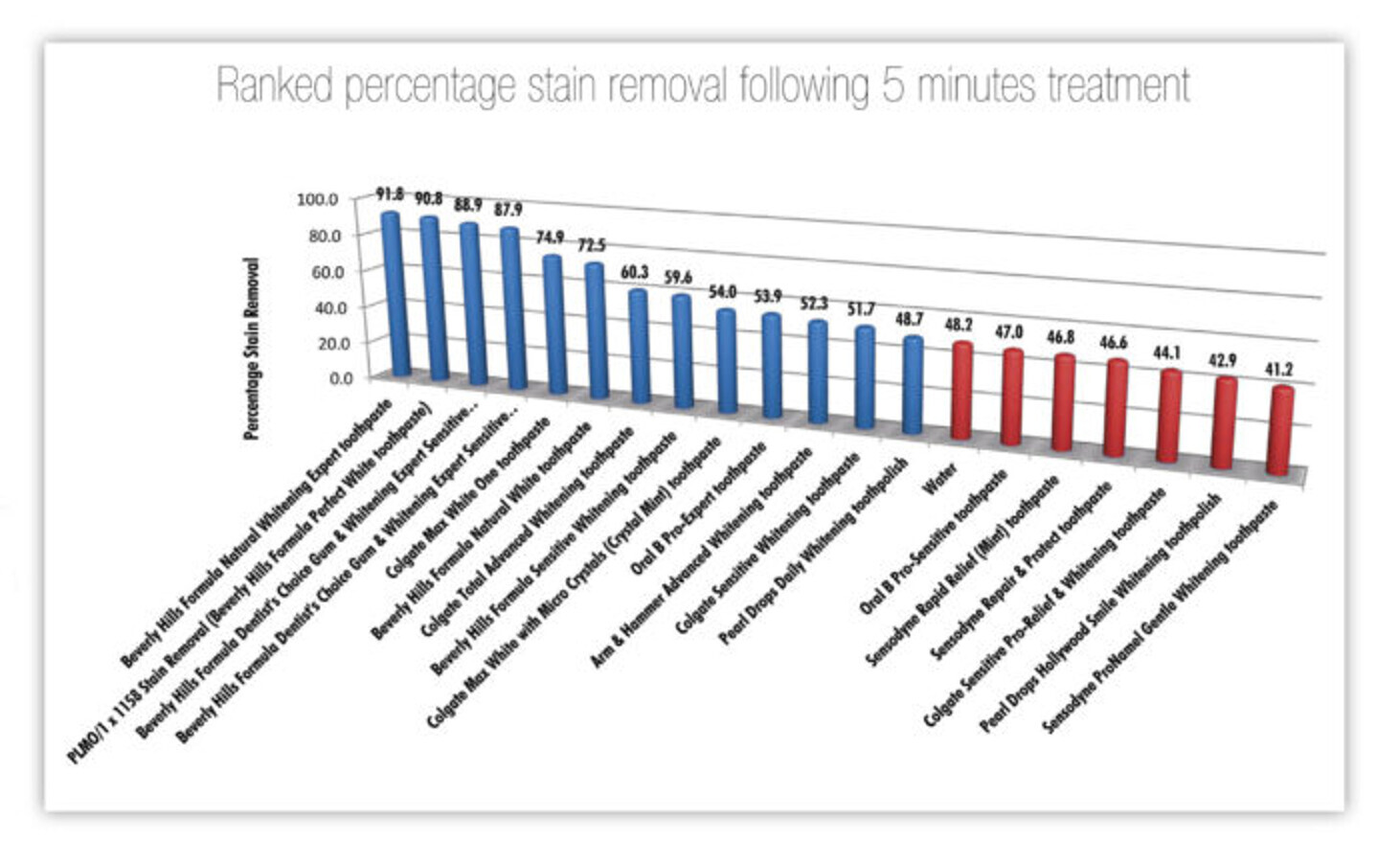 To support these abrasion results, an invitro laboratory study found that Beverly Hills Formula whitening toothpastes remove stains in just one minute. Beverly Hills Formula Perfect White (coded as “PLMO/1x1158 Stain Removal” in the study) toothpaste proved effective at removing stains with almost 91% of stains removed over a five-minute period and Beverly Hills Formula Dentists’ Choice Gum & Whitening Expert toothpaste removing almost 90% of stains. Meanwhile, other leading brands of whitening toothpastes and toothpolishes scored as low as 41%, a remarkably low percentage, considering water alone removes 48% of staining (2).