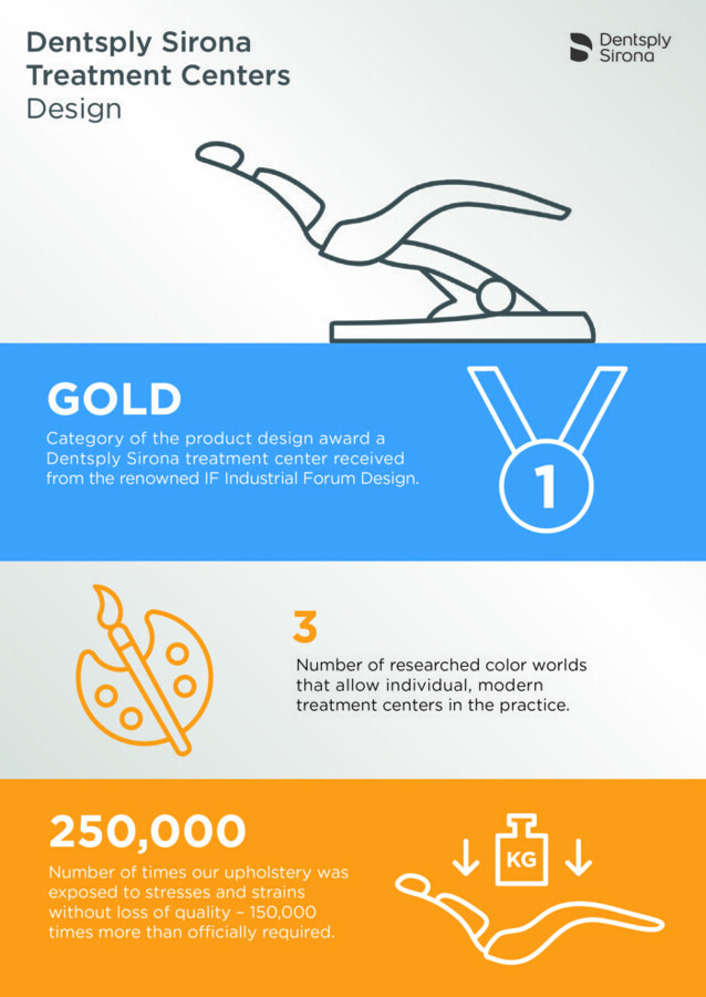 Award-winning design with three colour schemes “Our treatment centers’ design evokes trust and spreads an atmosphere of safety and reliability. The patient experiences this in a fraction of a second”, explains Susanne Schmidinger, Vice President Global Brand Marketing and Clincial Affairs, Equipment and Instruments. Dentsply Sirona’s treatment centers combine harmonious color design with a distinctively streamlined shape. The design concept provides three color worlds grouping together shades that harmonise particularly well with each other. This convincing design received renowned awards such as the iF Design Gold Award and the nomination for the German Design Award.