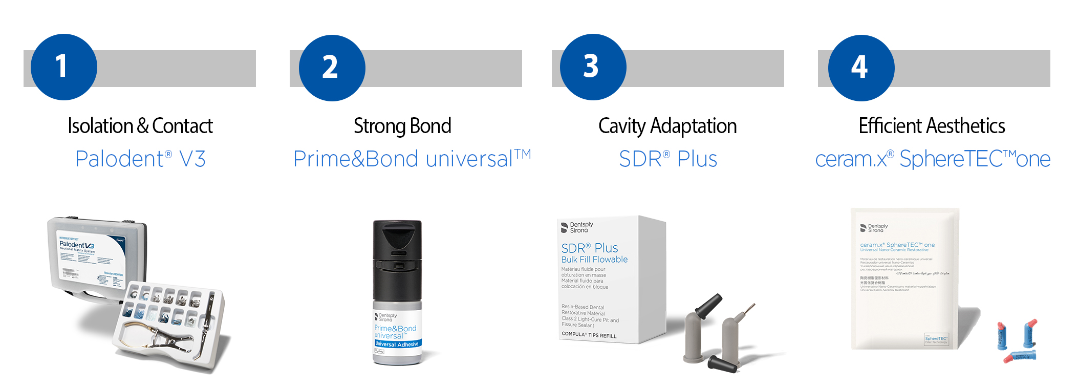 I have been using the Palodent V3 sectional matrix system with great success for 2 years. 8 months ago, my Dentsply Sirona sales representative visited my clinic and conducted a demo on the new Prime&Bond universal. He also gave me a sample of SDR and ceram.x SphereTEC which enabled me to try and see if the products stacked up against the current system I was using. Since then, I have been using the complete Dentsply Sirona Class II Solution daily and I am totally satisfied with the results I achieve.