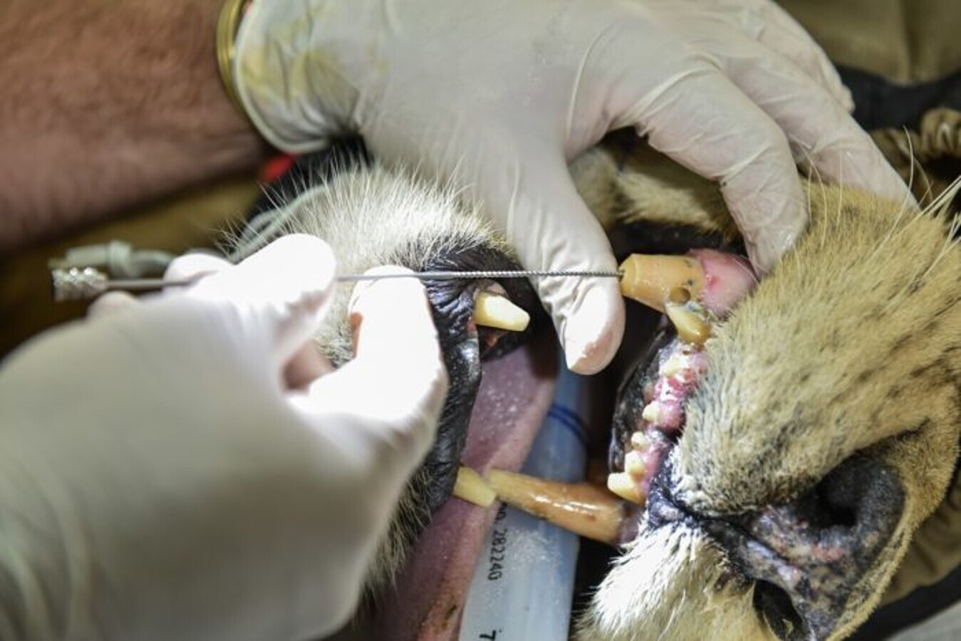 The lion and lioness, Abu Dhabi Wildlife Center, Al Wathaba Two adult lions received an extensive dental procedure as a result of fractured canine teeth. Although tooth fractures are common in big cats, the treatment of these fractures is still relatively new. Dr. Gerhard Steenkamp, a South African veterinary surgeon with 20 years of experience voluntarily performed the surgery. He has performed in excess of 300 dental procedures on carnivores including bears, cheetahs, hyenas, and leopards, and has executed over 100 root canal treatments and extractions on lions and tigers alone.