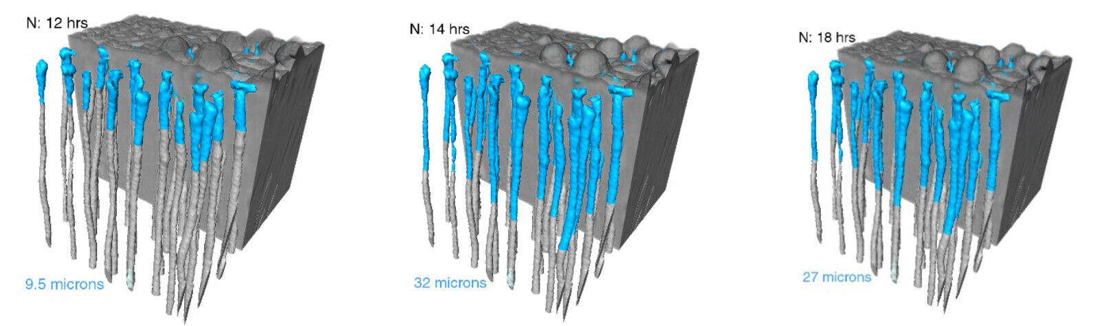 “Tubules are complex, varying in density, diameter and orientation from location to location. Occlusion is complex too, with ‘blocking’ dependent on depth and time; a tubule blocked after two hours may have the possibility of reopening after four. Therefore, measuring occlusion depth – and mapping blocking mechanisms over time – requires dynamic access to the 3D morphology of the tubules. This is only truly possible in a synchrotron.”