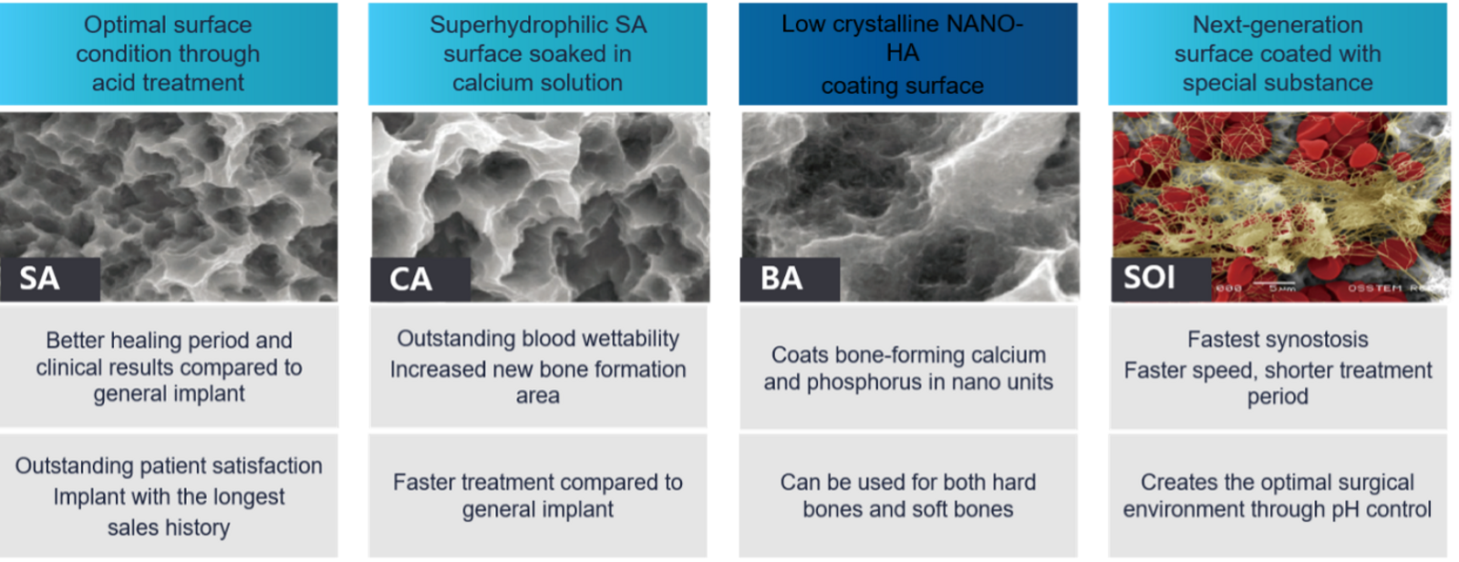 Considering surface treatment is its key technology, Osstem Implant is equipped with over five surface treatment lineups, the largest in the implant industry. However, in the global market, with the exception of Korea, it has been mainly selling the SA (sand blasted with alumina and acid etching) lineup. This is because SA is the most universally applied surface treatment technique, and is also the most suitable product in the stage of overseas market development.