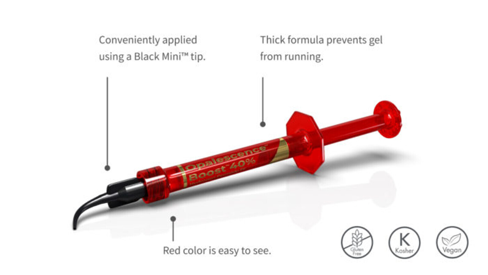 For many years, OpalescenceTM BoostTM with 40% hydrogen peroxide has been the state-of-the-art power whitening solution for bespoke medical in-office treatments. The whitening gel is suitable for the treatment of one or more teeth, parts of a tooth or for accelerated chairside-whitening techniques. It can also be used on non-vital teeth, including in-office intra-coronal whitening.