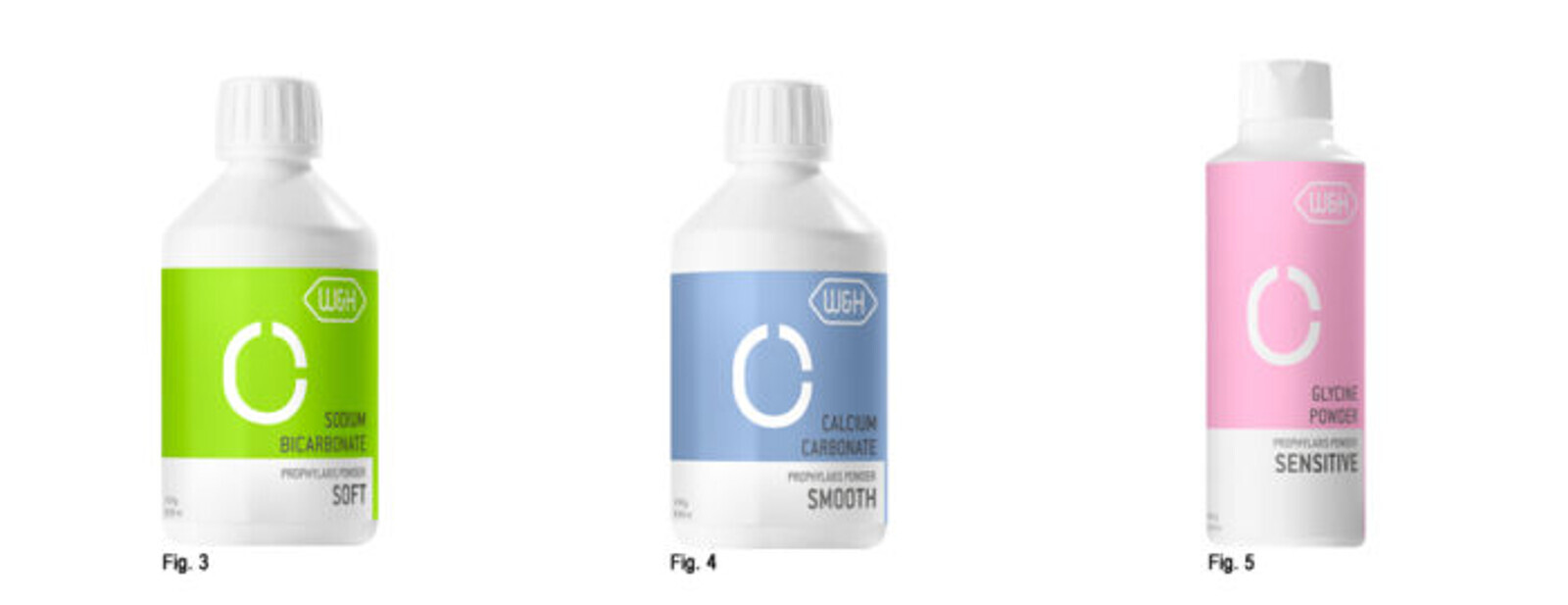 Fig. 3: The SOFT prophylaxis powder is based on sodium bicarbonate and has an average particle size of 40 μm. Fig. 4: The SMOOTH prophylaxis powder is based on calcium carbonate, has a particle size between 45 μm and 75 μm, a neutral taste and is free from sodium and silicon (Si). Fig. 5: The SENSITIVE prophylaxis powder is based on glycine, has an average particle size of 25 μm, is available in a sweetish taste and is water soluble. (Only available in the European Economic Area and in Switzerland.)