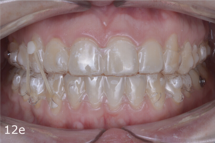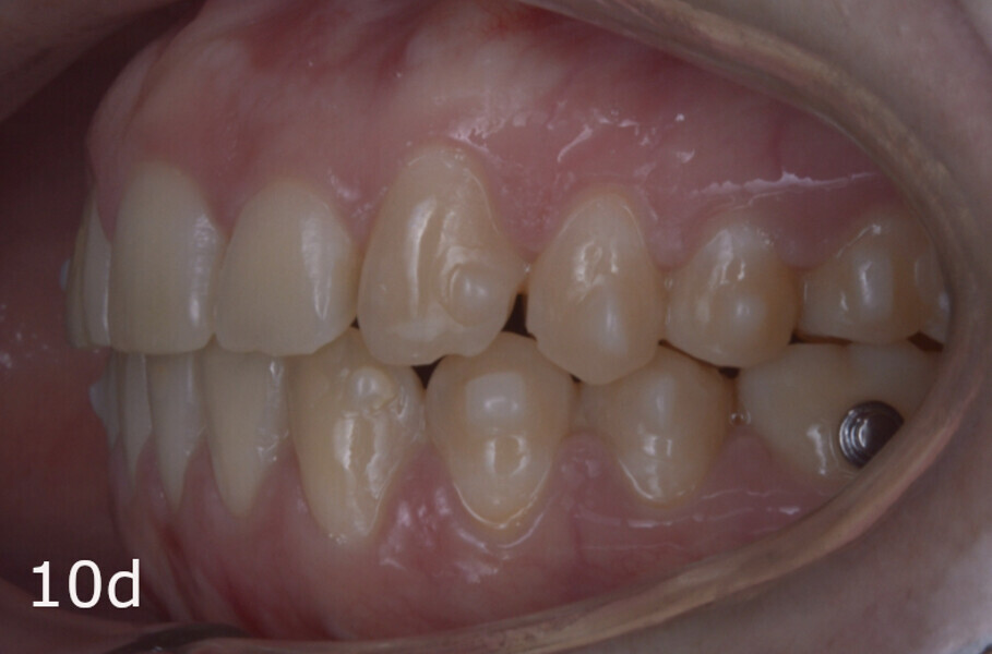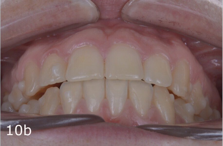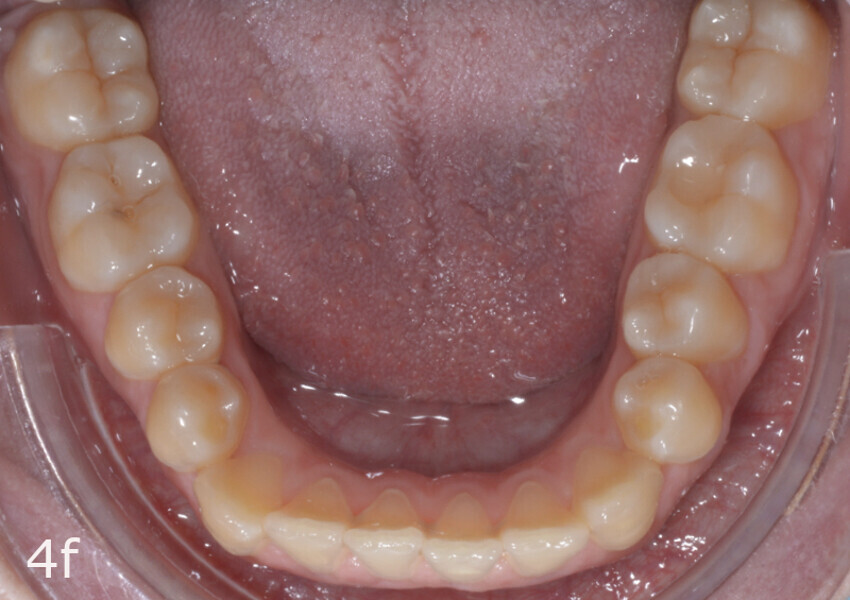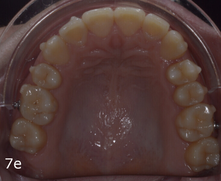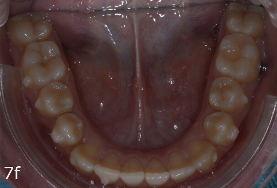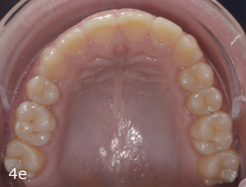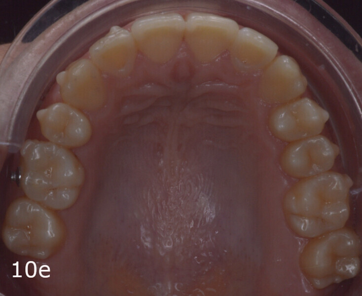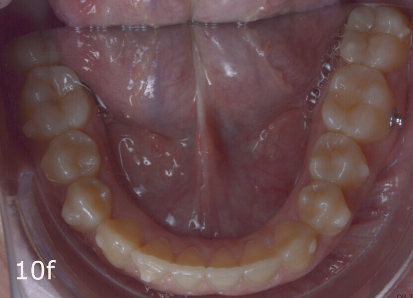 Figs. 13a–f: Final situation. The lack of overjet and overbite and the midlines had been improved and anterior and canine guidance achieved.