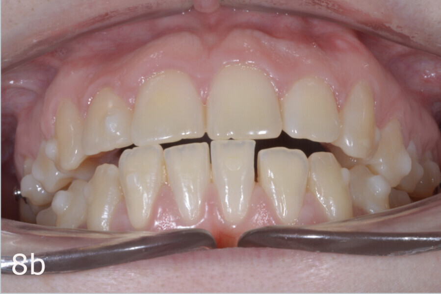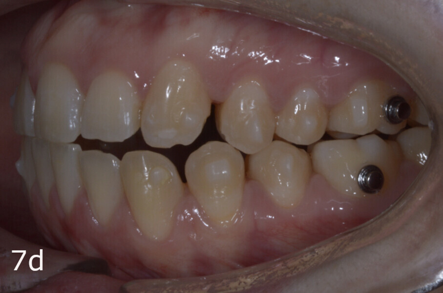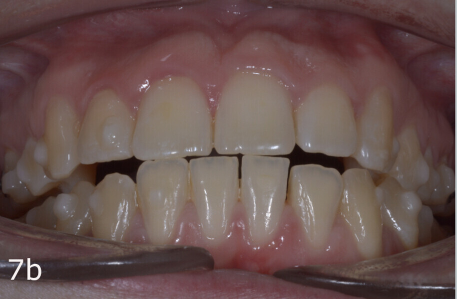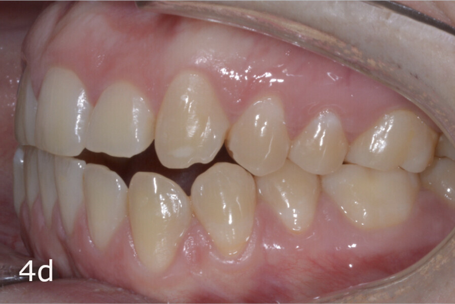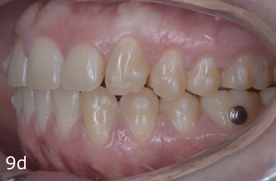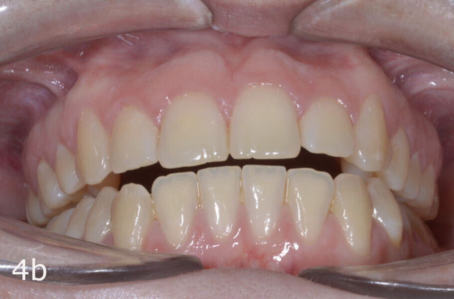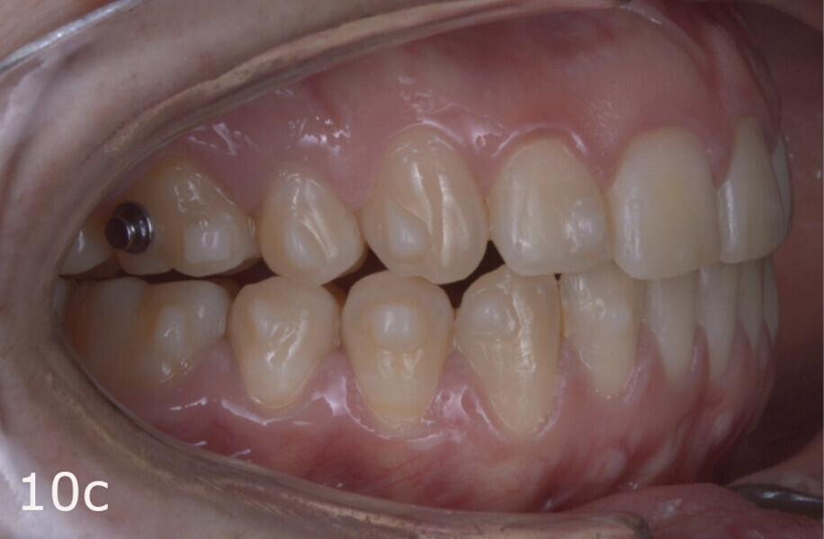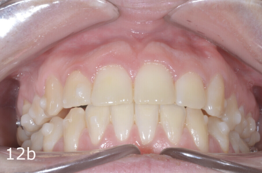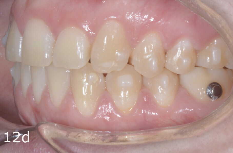 Figs. 13a–f: Final situation. The lack of overjet and overbite and the midlines had been improved and anterior and canine guidance achieved.