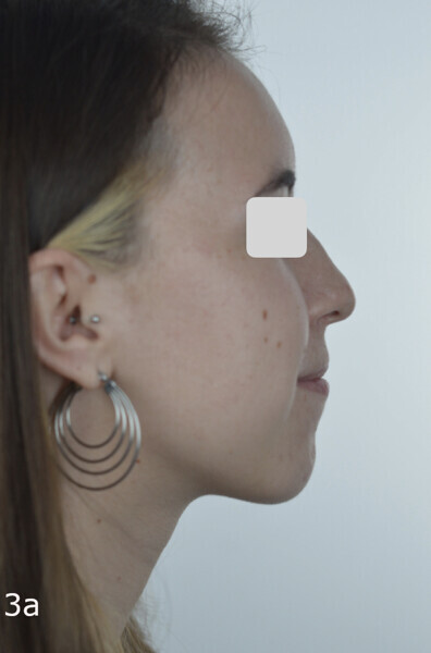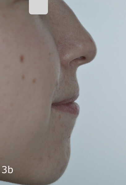 Figs. 15a–f: Extra-oral comparison of the situation (a, c & e) before and (b, d & f) after treatment. The mandibular deviation and the lower face height had been slightly corrected.