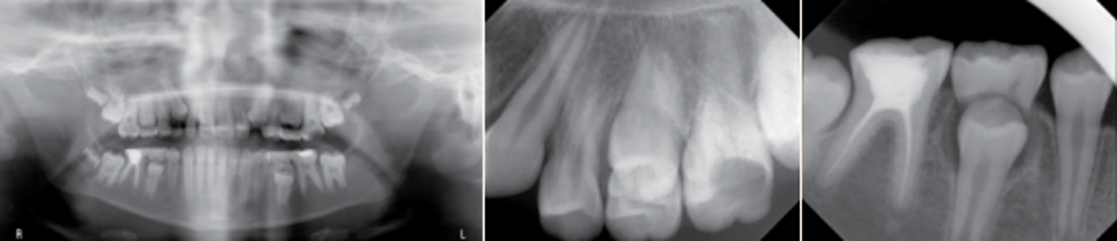 A ten-year-old patient (S.S) with no significant medical history or allergies presented to the Department of Paediatric Dentistry at Hamdan Bin Mohammed College of Dental Medicine (HBMCDM) in Dubai Healthcare City, Dubai (UAE). Complaining of slight pain due to a dislodged filling in her upper left region. Presently the tooth is asymptomatic. The pain is described as intermittent during the day, lasts for a while (hour or less), does not stop her playing or affect her sleep.