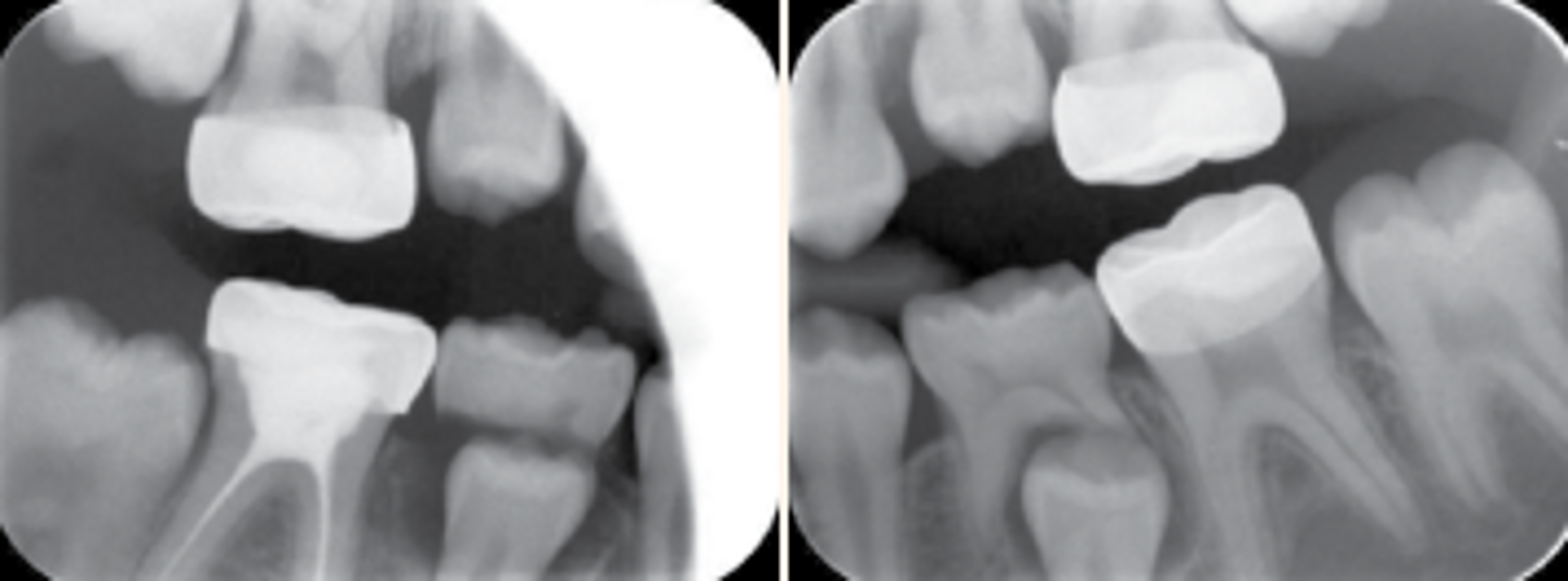 Fig. 4 (a & b). Bitewing radiographs taken 6 months post treatment completion .Radiographic finding, fully seated crowns of all first permant molars with no progression of any pathological lesion underneath the SSC.