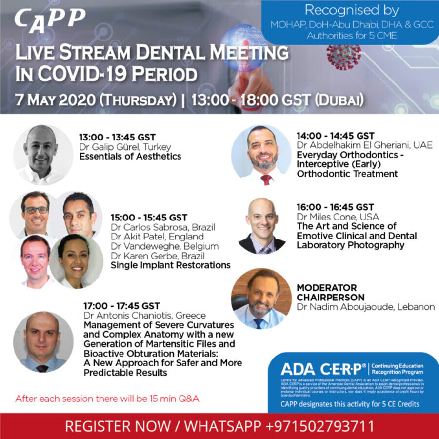 CAPP (Centre for Advanced Professional Practices) will host Part 3 of its CAPP Live Stream Dental Meeting In Covid-19 Period on 07 May from 13:00 to 18:00 UAE GST Time.