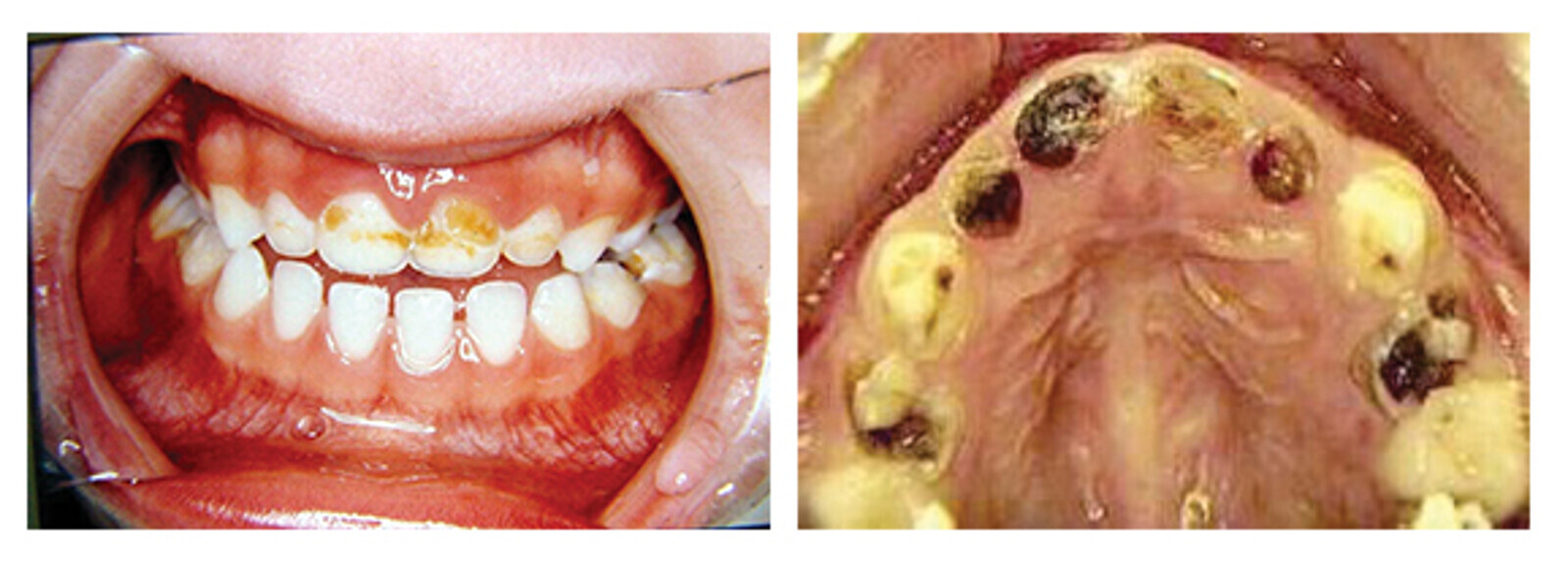 In most cases of ECC, the first clinical sign is a band of dull white demineralization along the gingival line of the maxillary incisor teeth. As the lesion progresses, the white bands develop into cavities. This results in a brown or black collar around the necks of the incisors. In advanced cases, the lesions may become so severe that the crowns of the teeth are amputated leaving only decayed brownish-black root stumps (Figure 1). The commonly involved surfaces are the labial, palatal, mesial, distal of maxillary incisors and of the maxillary and mandibular canines. In the first and second primary molars, the occlusal surface is commonly affected [12]. According to Ripa [4], the reason for this unique distribution is related to three factors: 1) the chronology of tooth eruption; 2) the duration of the deleterious habit; and 3) the muscular pattern of infant sucking.