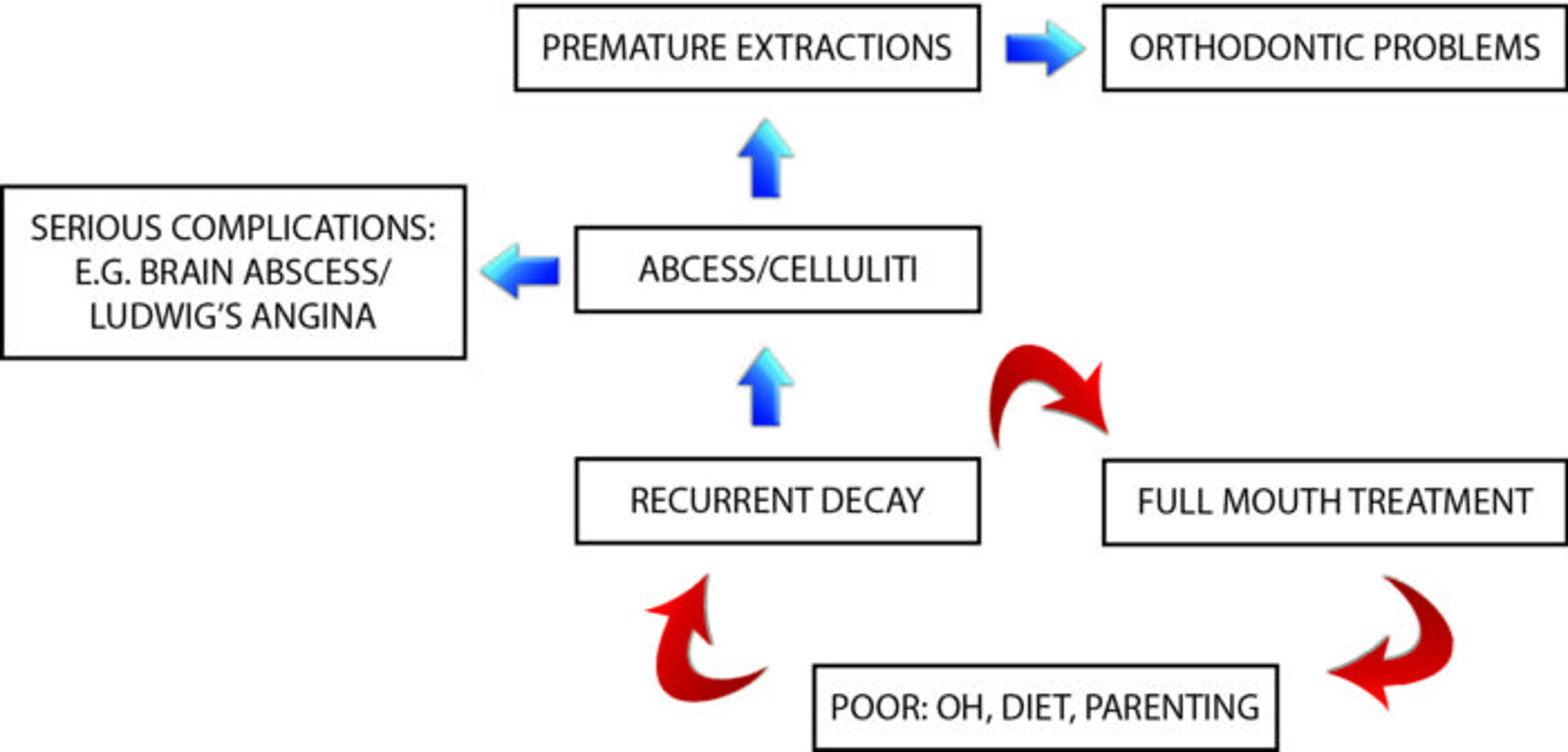 Depending on the severity and the extent of dental decay, ECC may lead to a significant impact on the child’s oral and general health. Deep untreated carious lesions lead to pain and discomfort, inability to properly chew food and the child may avoid eating because of pain which may lead to weight loss and failure to thrive [31]. In severe cases, pulpal necrosis in primary teeth may lead to a dental abscess formation which can cause pain and damage the developing permanent tooth. If there is a necessity for premature extraction, primary tooth loss may result in various orthodontic complications (Figure 2). Premature extraction of primary maxillary incisors may also lead to problems in speech, normal development of language and esthetic which may affect the personality and self- esteem of the child. Untreated ECC lesions may cause abscess, cellulitis and spread of infection, which may result in serious and fatal complications such as brain abscess and Ludwig’s angina (Figure 2). Management of ECC complications requires increased emergency room visits and hospitalization. The socio-economic consequences of ECC manifest in increased treatment costs and missing school time as well as time off from employment for parents [32, 33].