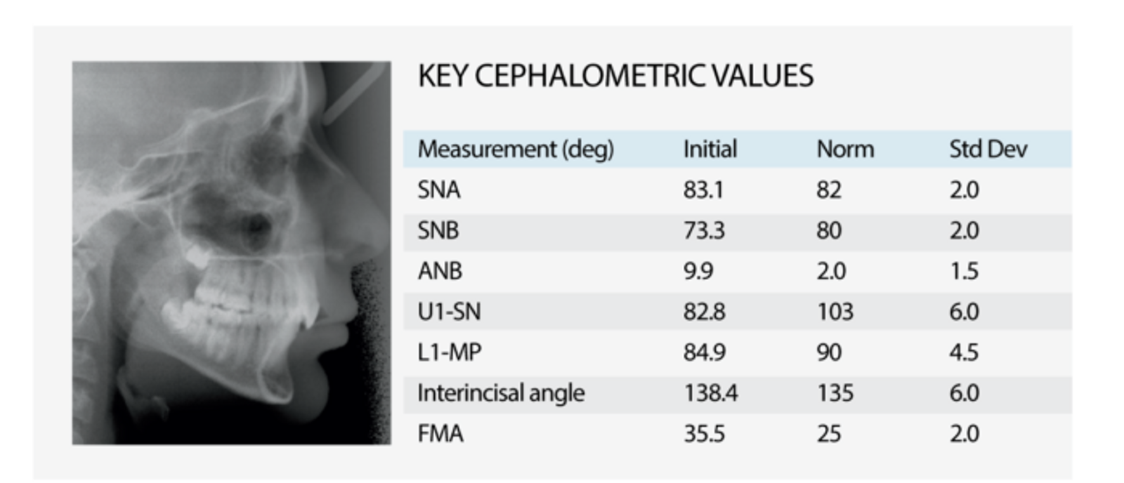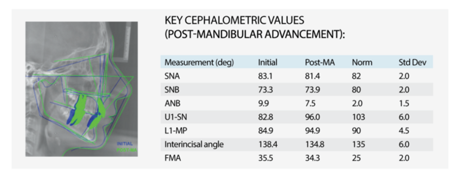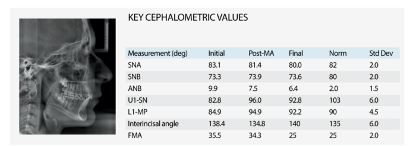 The sagittal improvement and the amount of upper incisor torque achieved, were both good (ΔANB = -3.5˚ and ΔU1- SN = +10.0˚, respectively). The final upper incisor position was esthetically pleasing, but slightly under-torqued relative to orthodontic norms (U1-SN = 92.8˚), so additional incisor inclination might have allowed the mandible to advance a little bit more.