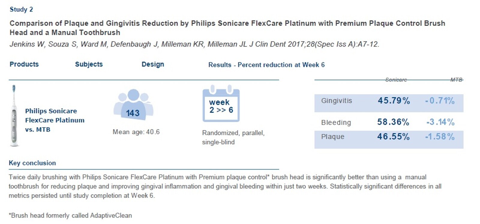 Similar outcomes were also observed in a clinical trial comparison between the Philips Sonicare FlexCare Platinum with Premium Plaque Control brush head, and a manual toothbrush, following 2 and 6 weeks of use. For example, by the Week 2 visit following use of the assigned product, the mean percent reduction from Baseline in the assessment of gingival bleeding was 47.97% for the Sonicare group, and 8.64% for the manual toothbrush group. (Study 2)