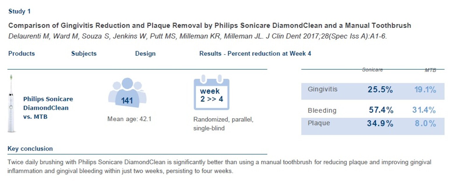 which reports a randomized, parallel-design clinical trial, the Philips Sonicare DiamondClean powered toothbrush was observed to be statistically significantly superior to use of a manual toothbrush, within 2 weeks of use, persisting to study conclusion at 4 weeks, in reducing surface plaque, gingivitis and gingival bleeding. (Study 1)