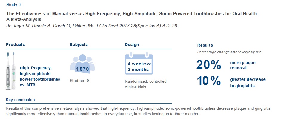 The third manuscript reports on a meta-analysis that was initiated to determine whether these discrete observations of differences in plaque and gingivitis reduction between ‘sonic’ powered and manual toothbrushes, were supported in a broad investigation of publicly available literature. The study authors queried multiple publicly accessible databases for clinical trial outcomes using a pre-defined set of keywords. Thereafter, they performed a composite analysis of the results. The paper, which includes data from 18 studies, also concludes that use of a high-frequency, high-amplitude sonic-powered toothbrush is superior to manual toothbrush use for reducing plaque and gingivitis. (Study 3)