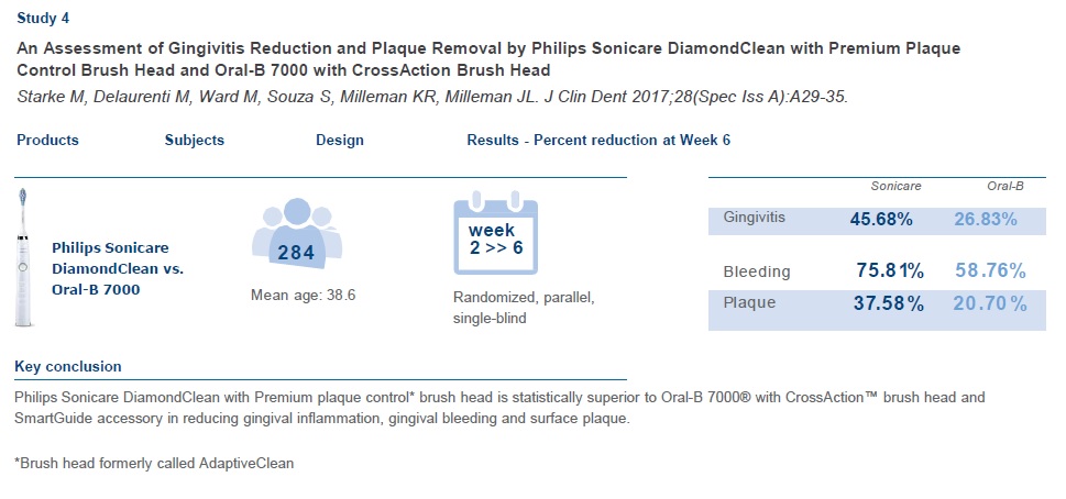 The fourth manuscript reports on a comparison between two powered toothbrushes, the Philips Sonicare DiamondClean with Premium Plaque Control brush head, and the Oral-B 7000 with CrossAction brush head. The outcomes of this large clinical trial demonstrated that the Sonicare power toothbrush performed significantly better than that Oral-B power toothbrush in reducing surface plaque, gingivitis and gingival bleeding, following 2 and 6 weeks of use when used in respective deep clean mode. In addition, the study analysis also included an insightful proportion analysis, where the percentage of subjects who achieved at least a 20% reduction in gingivitis at Week 2 and Week 6, was significantly better in the Sonicare than the Oral-B group. (Study 4)
