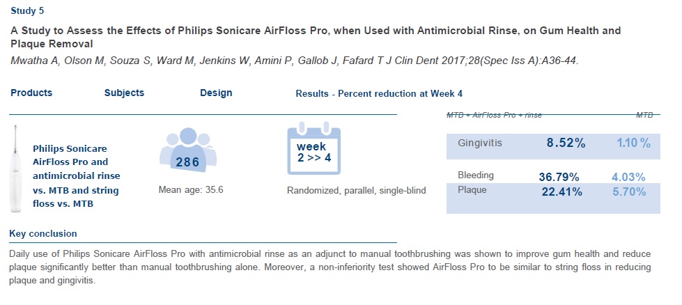 The final manuscript provides important clinical evidence demonstrating the efficacy of the Sonicare AirflossPro interproximal cleaning device. The device was developed with the ‘non-flosser’ in mind; that patient who just can’t seem to adopt a flossing regime, but who really needs better interproximal oral hygiene. As such, the study was designed to show that manual toothbrushing, followed by once-daily interproximal cleaning with Sonicare AirflossPro used with antimicrobial rinse, was at least as good as manual toothbrushing followed by once-daily string floss use, in reducing plaque and gingivitis. The study outcomes demonstrate that this is, indeed, the case at both the Week 2 and Week 4 timepoint. (Study 5)
