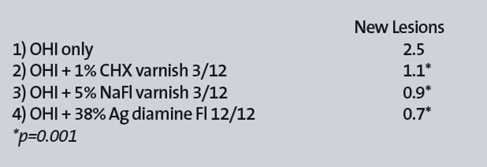How can we minimize the development of root caries? A recent Randomised Controlled Trial (RCT) by Tan (6) investigated 306 generally healthy elders having at least 5 teeth with exposed sound root surfaces living in 21 residential homes. They were randomly allocated into one of four groups and followed for 3 years. A control group was given oral hygiene instruction and regular professional cleanings while 3 test groups had either 1% Chlorhexidine varnish or 5% Na Fluoride varnish applied every 3 months or 38% Ag Diamine Fluoride applied annually. The results are shown in Table 2.