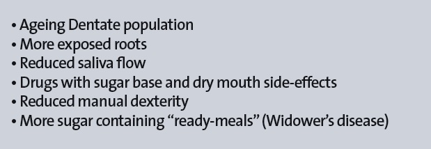 Root Caries is in fact a testament to the effectiveness of the dental profession in extending the life of teeth into old age. It is however a major challenge to a profession largely unfamiliar with its management. Factors contributing to this increasing problem are listed in Table 1.