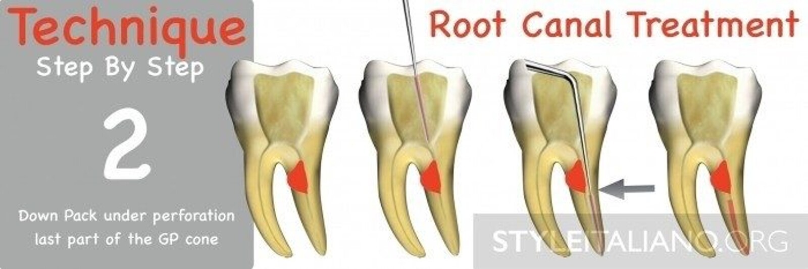 Fig. 3: The second step is represented by a conventional RCT, but obturation is done with last part of a gutta percha cone, starting with warm gutta percha condensation deeper than the perforation level avoiding any contamination of perforation area with sealer and GP. A plugger is used for GP condensation.