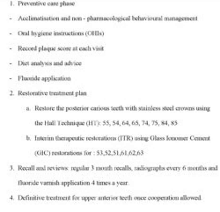 He also had initial caries on 53, 52, 51, 61, 62 & 63. There was no known trauma history. His initial cooperation was categorized as “pre-cooperative”. MF’s behavioural scale was assessed to be negative initially but improved dramatically to positive behavior as treatment progressed. Treatment options for the carious primary molars that were discussed and explored with MF’s father were; prevention only, conventional restorative treatment using local anaesthesia (LA), the “Hall Technique” with no LA (and restorations of the upper primary incisors) or full mouth rehabilitation under general anaesthesia (GA). MF’s father was keen for his son to receive dental treatment in the dental chair rather than under GA due to many reasons including financial constraints (children’s dental GA is not routinely provided by a free public service -available to everyone- in the UAE as it is in the UK for example). After sufficient consideration, the father consented for the HT as the child’s cooperation for LA was not forthcoming and he was adamant about avoiding GA.