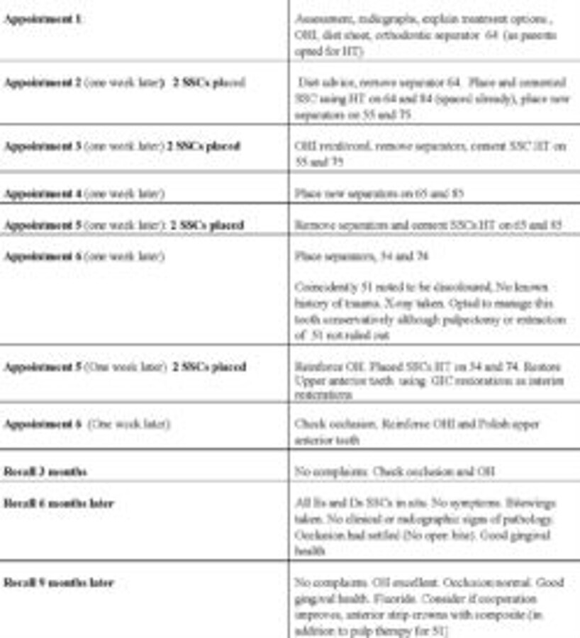 Over a period of two months and following the HT protocol3, the child had all his eight primary molars fitted with SSCs and cemented with GIC. No LA was used. The molars were fitted with elasticated orthodontic separators in order to create space to prepare the teeth to receive the SSC a week later. Two molars were treated per appointment (see Table 2).