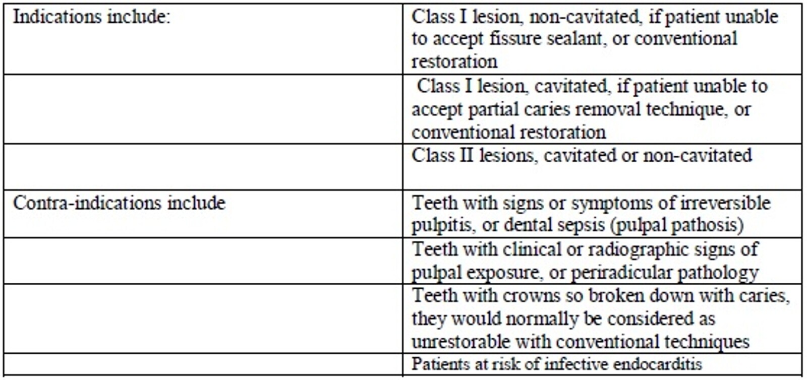 SSCs placed using the Hall technique are not suitable for all child patients with caries. There are selection criteria (21) that should be assessed before considering this technique. These are summarized in Table 1. The dentist should consider the Hall technique as one of the available clinical methods for treating the carious primary molar but not as a replacement for conventional methods.